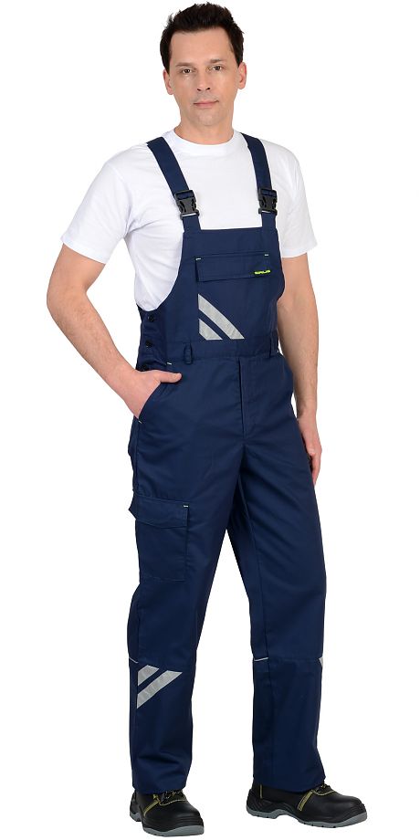 Полукомбинезон застежкой гульфика на тесьму - "молния" с боковой застежкой на пуговицы, с различными функциональными карманами, с элементами из СВ кант и СОП, обеспечивающие безопасность работы в условиях пониженной видимости. ГОСТ 27575-87