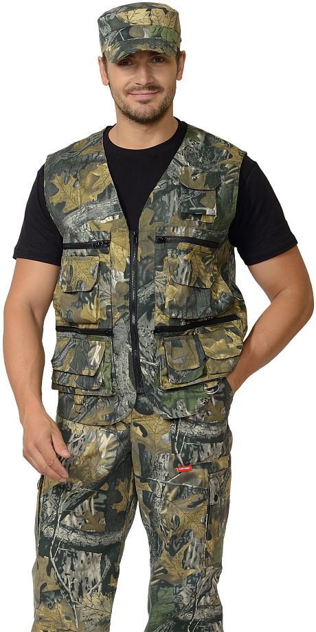 Тк. смесовая ВО, 210 г/кв.м. Застёжка спереди и 4 карманов на "молнию", 6 карманов с клапаном и "липучкой", полукольца, хлястики по талии. ТУ 8550-001-81391241-2008.