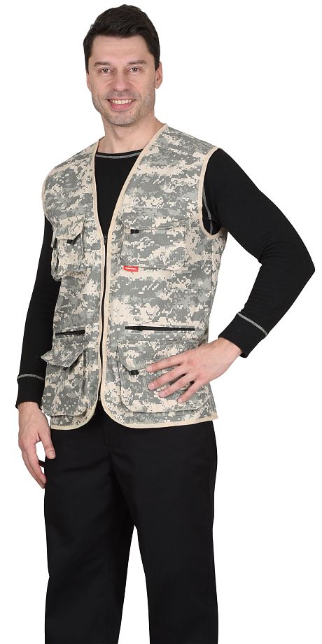 • Жилет с V- образным вырезом горловины, с настроченными и отрезной кокетками, с центральной застежкой на тесьму - «молния», с накладными фигурными верхними карманами и фигурными клапанами застегивающиеся на потайную липучку, с горизонтальными карманами в рамку на тесьму - «молния»,с нижними фигурными карманами и фигурными клапанами застегивающимися на потайную липучку.